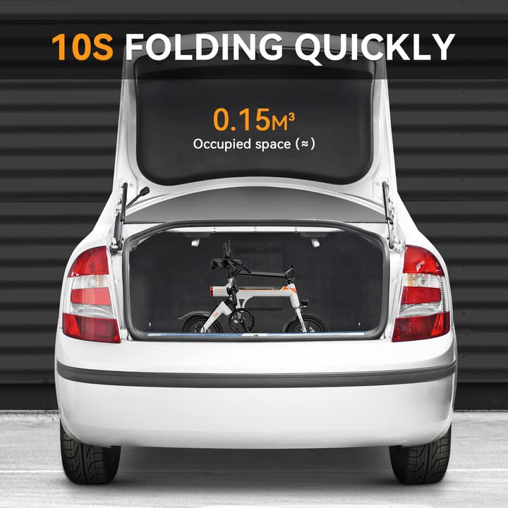 - Foldable Design - Our 14 inch small electric bike is designed for portability and convenience, making it perfect for urban commuters and anyone with limited storage space. Its compact size and foldable handlebar & pedals make it easy to store in small apartments, offices, or even the trunk of a car.